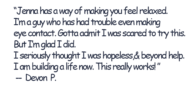 "Everyone wants to enjoy a nice social life, feel easy with people, have fun & relax. I couldn't. I spent my adult life in hiding. I wish I had known about Jenna sooner. I want to tell anyone who is considering this, go for it. Take a chance. You will be glad. Even if you've been withdrawn and felt socially awkward you can improve. I worked with Jenna to unlearn my old story, make new habits, and get rid of that mean "inner critic" I had tormenting me. It felt good to have feedback too. You might feel like this is beyond you but it isn't. That's just your negative old story coming back to haunt you. It is unbelievable how different life can be." ~ Jessica R.